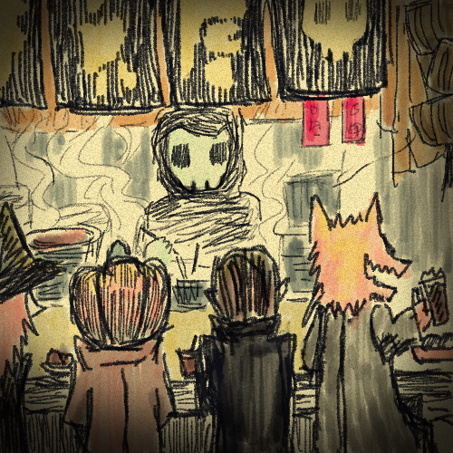 ハロウィン後におつかれさまー!とやってるモンスターたちを描いた。